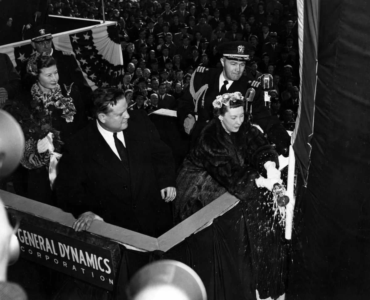 First Lady Mamie Eisenhower christens the Nautilus at Naval Base Point Loma in California. Photo courtesy the U.S. Naval History and Heritage Command.
