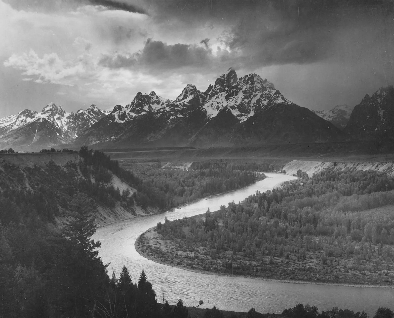 This photograph by Ansel Adams shows the Snake River with the Grand Tetons in the background. Photo courtesy the National Archives.