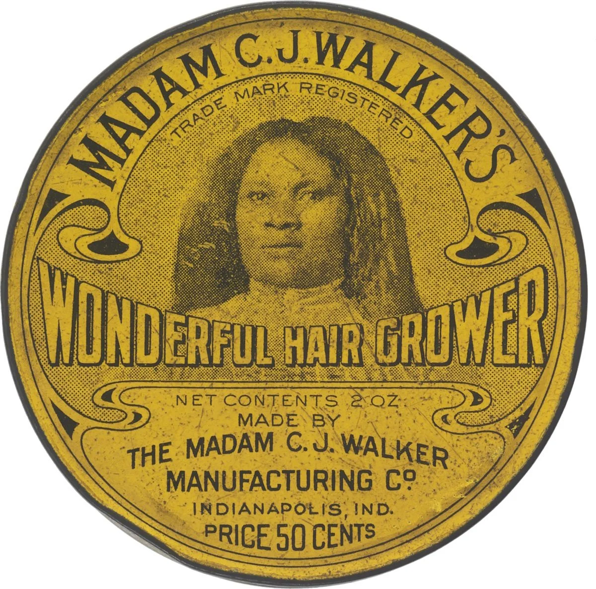 Tin for Madam C. J. Walker's Wonderful Hair Grower. Image from the Collection of the Smithsonian National Museum of African American History and Culture, Gift from Dawn Simon Spears and Alvin Spears, Sr.